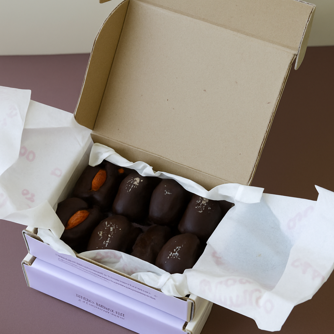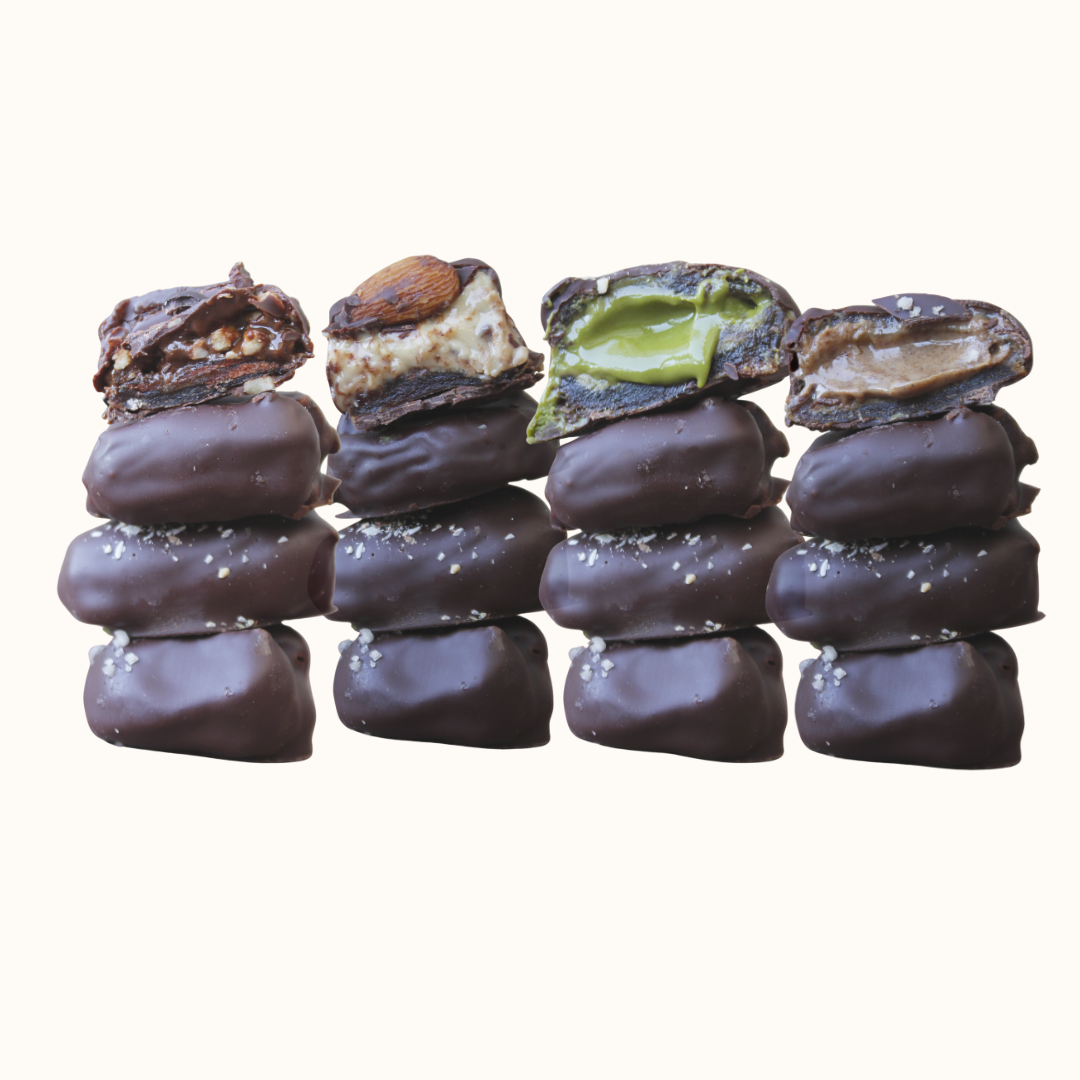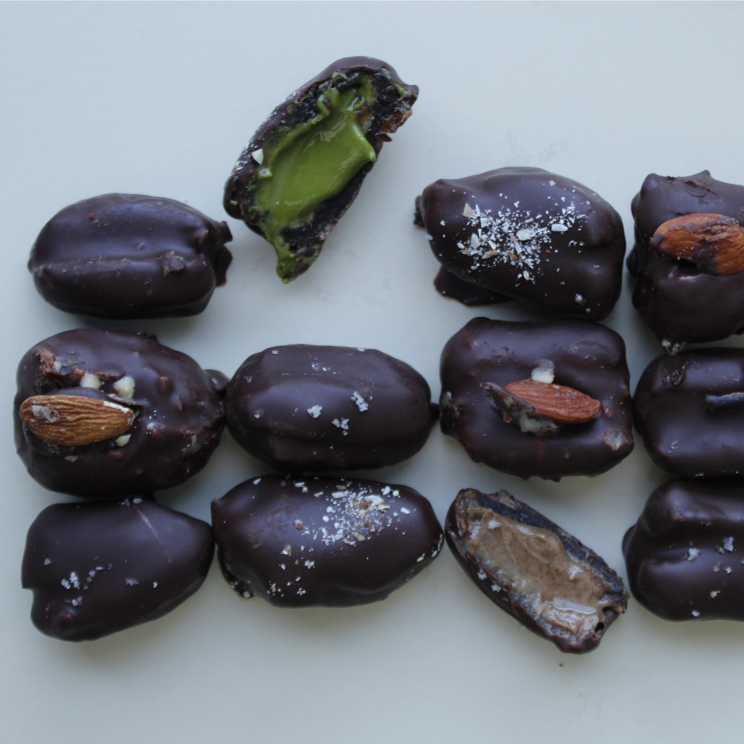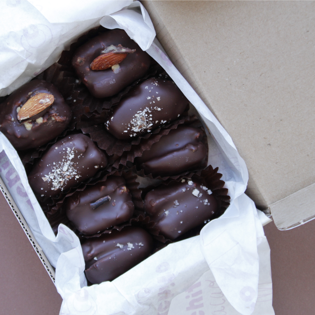 Caja con 8 dátiles medjool rellenos de los deliciosos spreads de Sarai’s Superfood Spreads y cubiertos de nuestro delicioso chocolate 75% cacao.