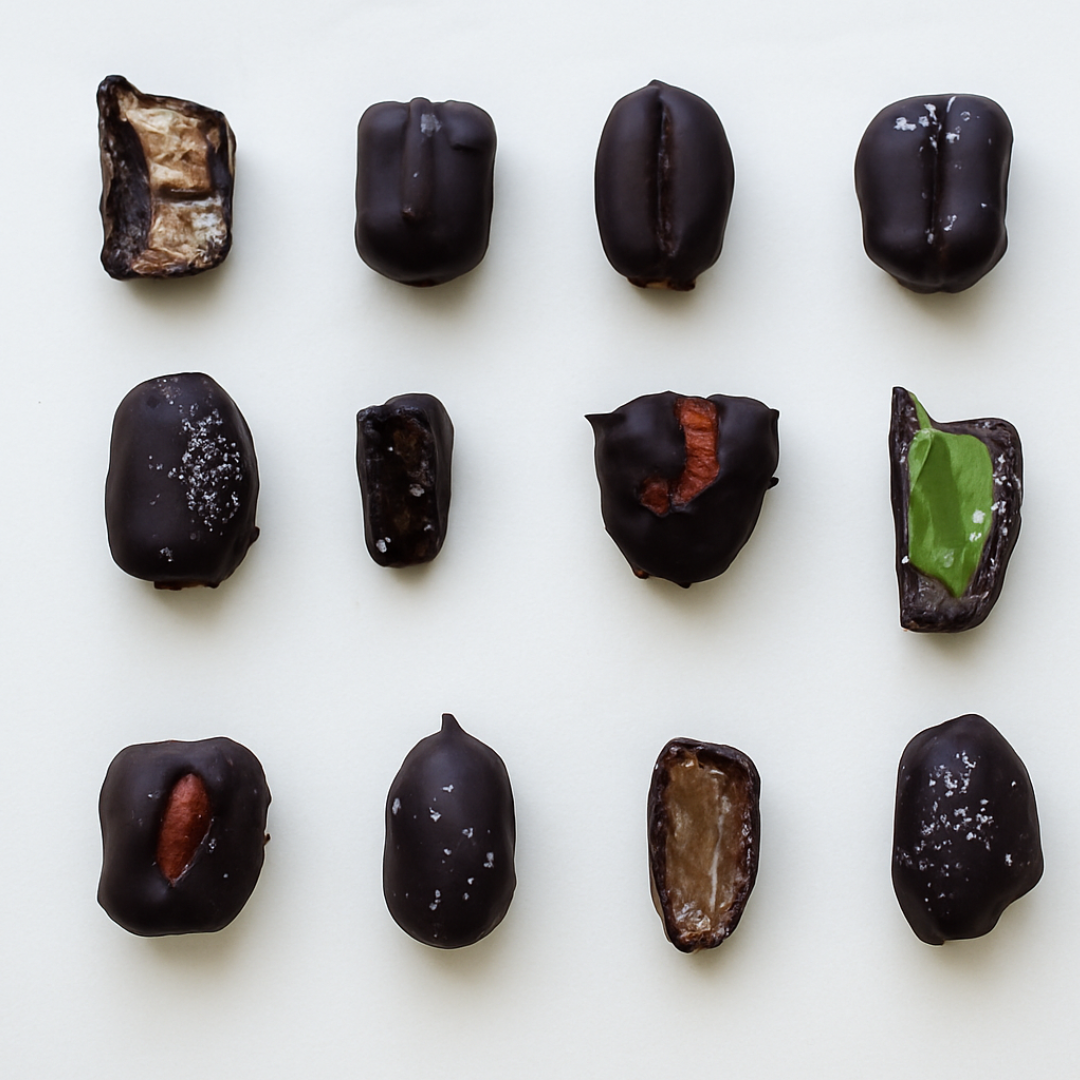 Sabor Maca Canela: dátil “medjool”, spread Sarai’s de maca canela, chocolate 75% cacao, flor de sal.